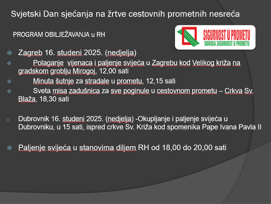 Kao i svake godine, ciljevi Svjetskog Dana sjećanja na žrtve cestovnog prometa (WDR) pa i ove 2025. su pružiti platformu žrtvama prometnih nesreća i njihovim obiteljima kako bi obilježili jedan dan sjećanjem na sve poginule i teško ozlijeđene osobe na cestama: